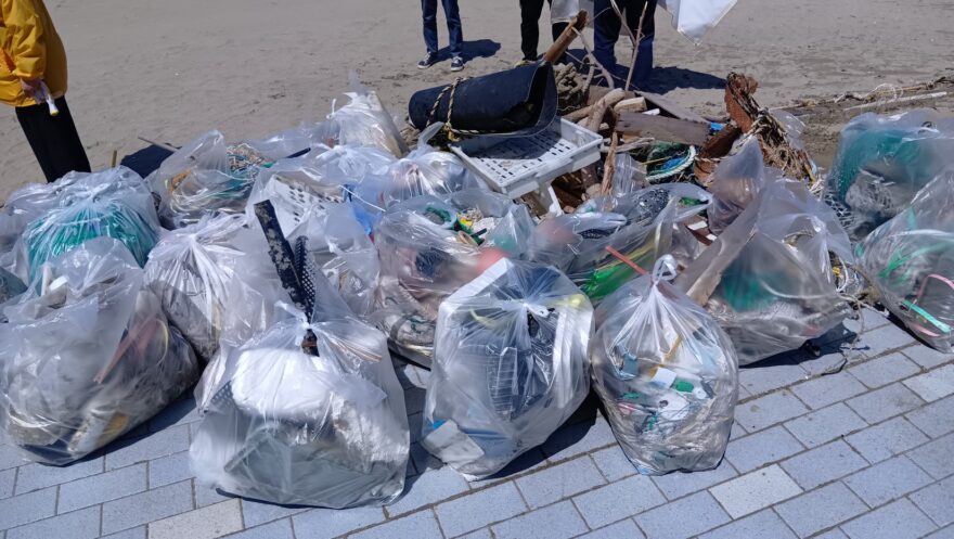 1時間の海岸清掃で、50リットルのごみ袋40袋以上に加え、大きなフロート、流木などを回収しました。
