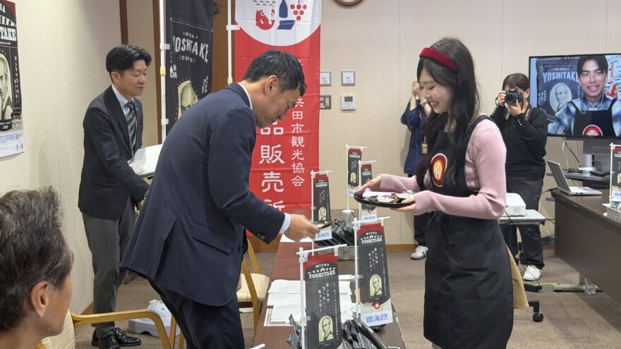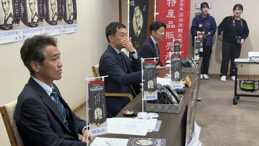 この功績を広く知ってもらおうと、「ヨシタケコーヒー入りキャンディ」が商品化され浜田市役所でお披露目されました。