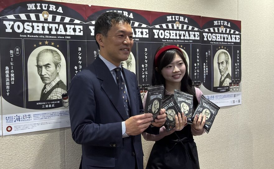 世界で初めて「缶コーヒー」を開発・販売した島根県浜田市出身の三浦義武(みうら・よしたけ)さんの功績を広く知ってもらおうと、三浦さんのコーヒー「ヨシタケコーヒー」入りのキャンディが開発され、地元・浜田市でお披露目されました。